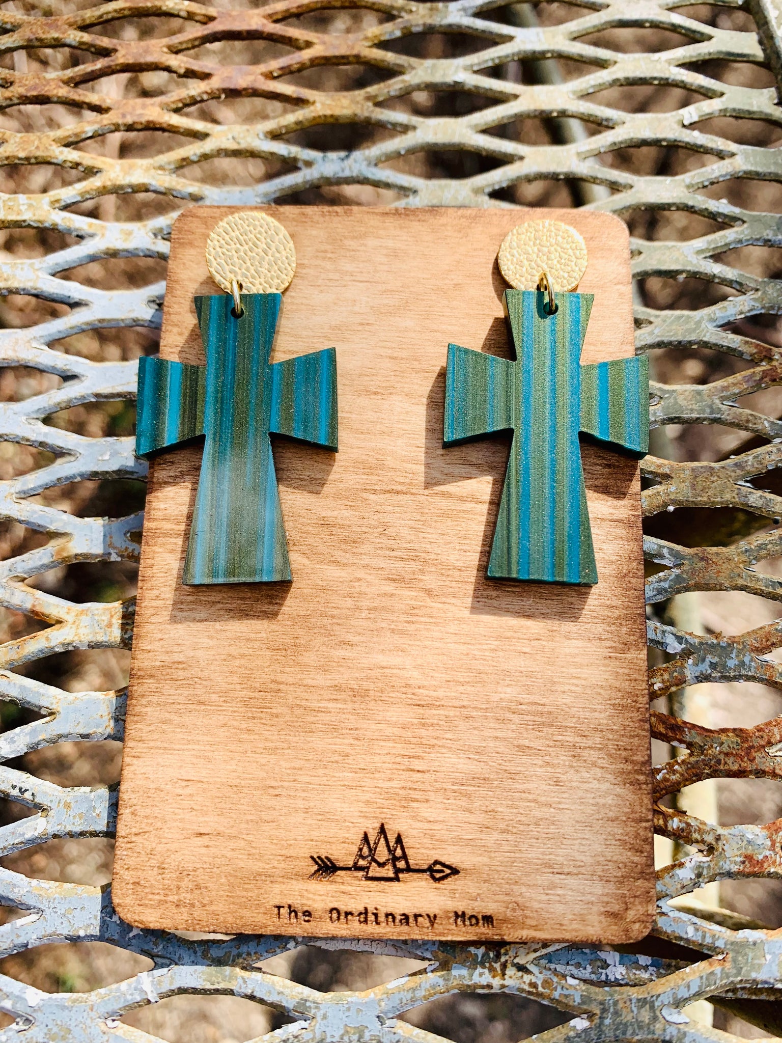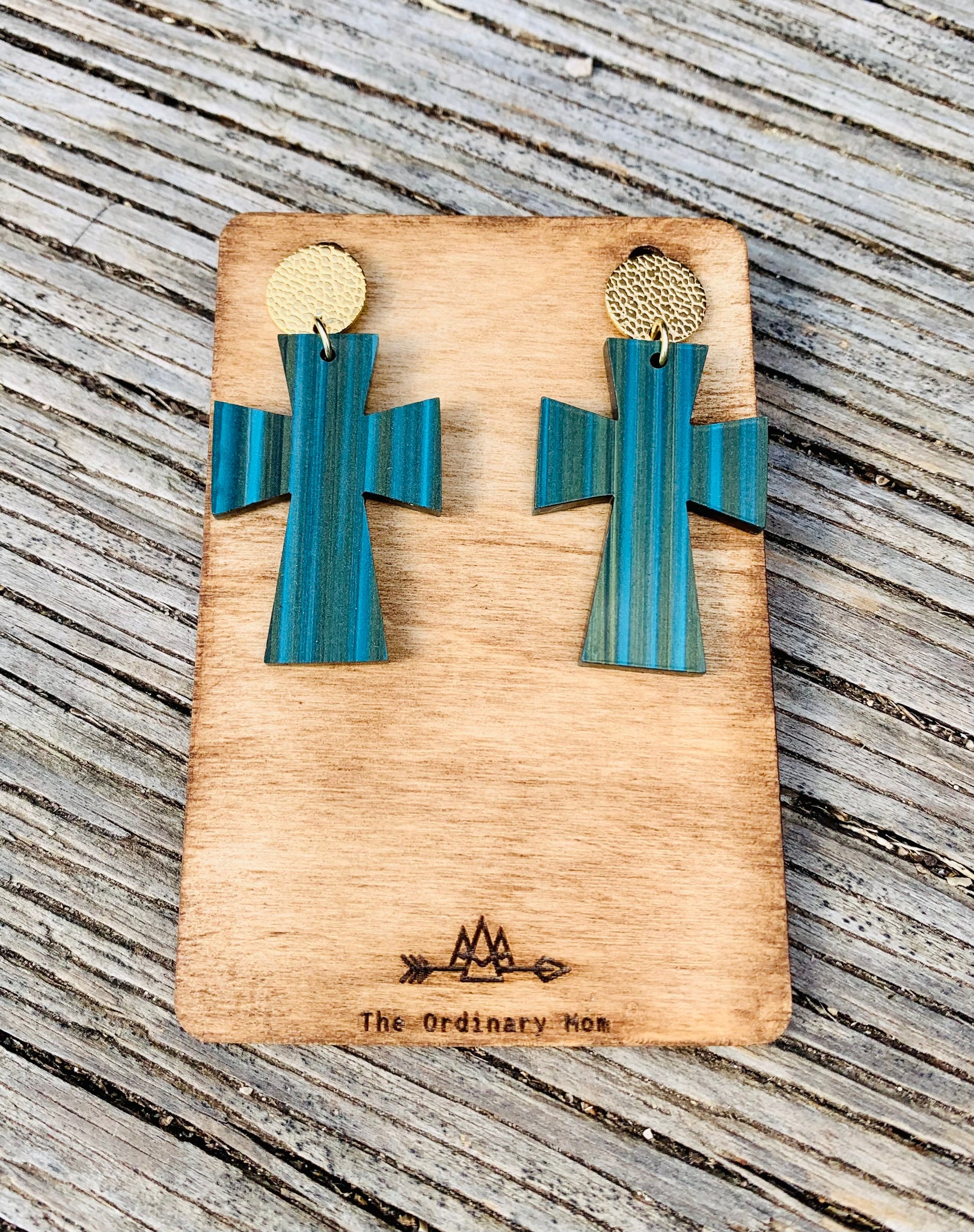 The brushed turquoise acrylic is simply beautiful! It’s a rustic turquoise base with brushed tones of gold and bronze, giving each piece a unique finish. The crosses measure just under 1.5” and are about 1” in width.