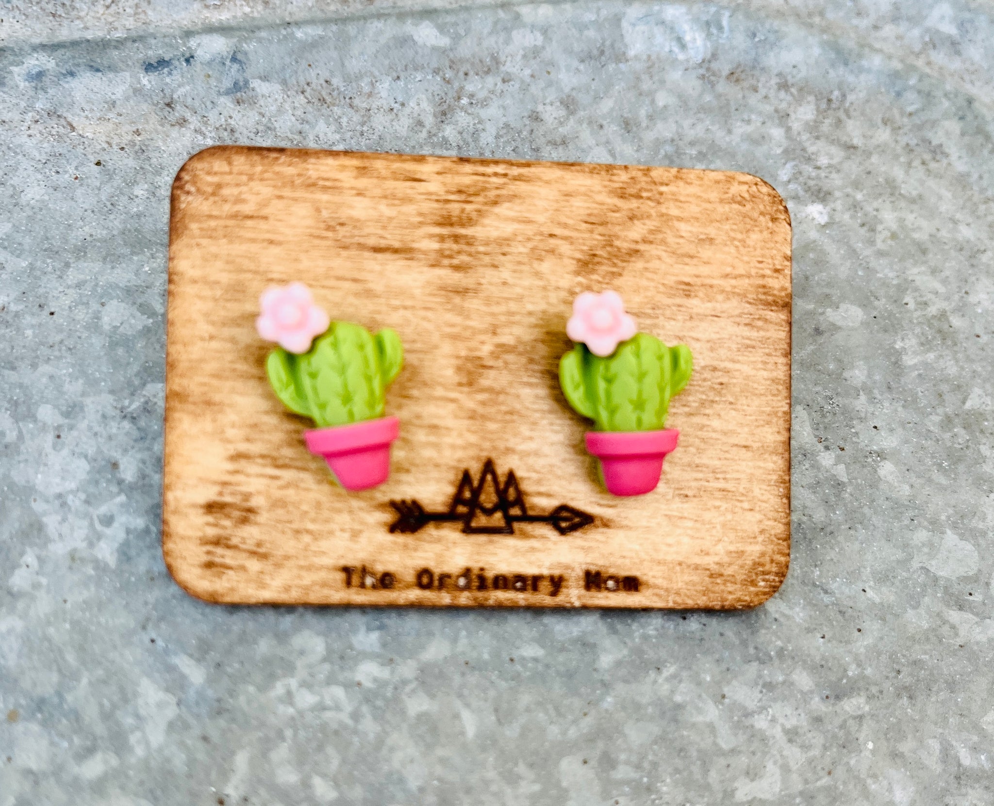 Soft clay cactus nestled in a pink pot with a tiny light pink flower is just the sweetest little stud a girl could have!