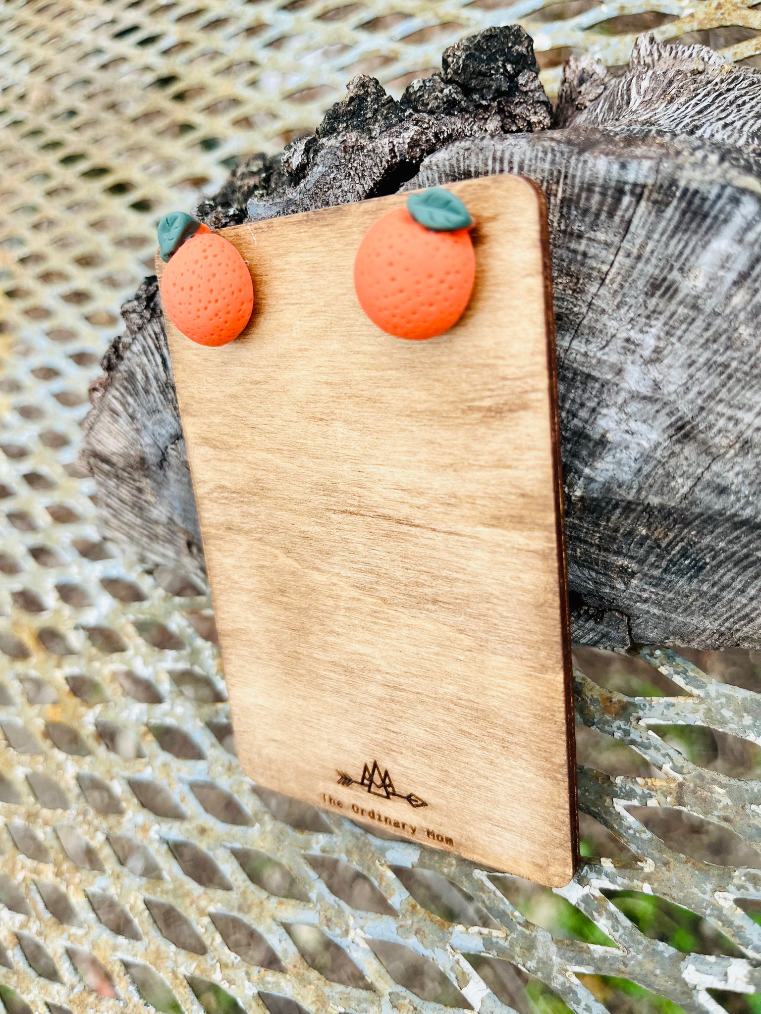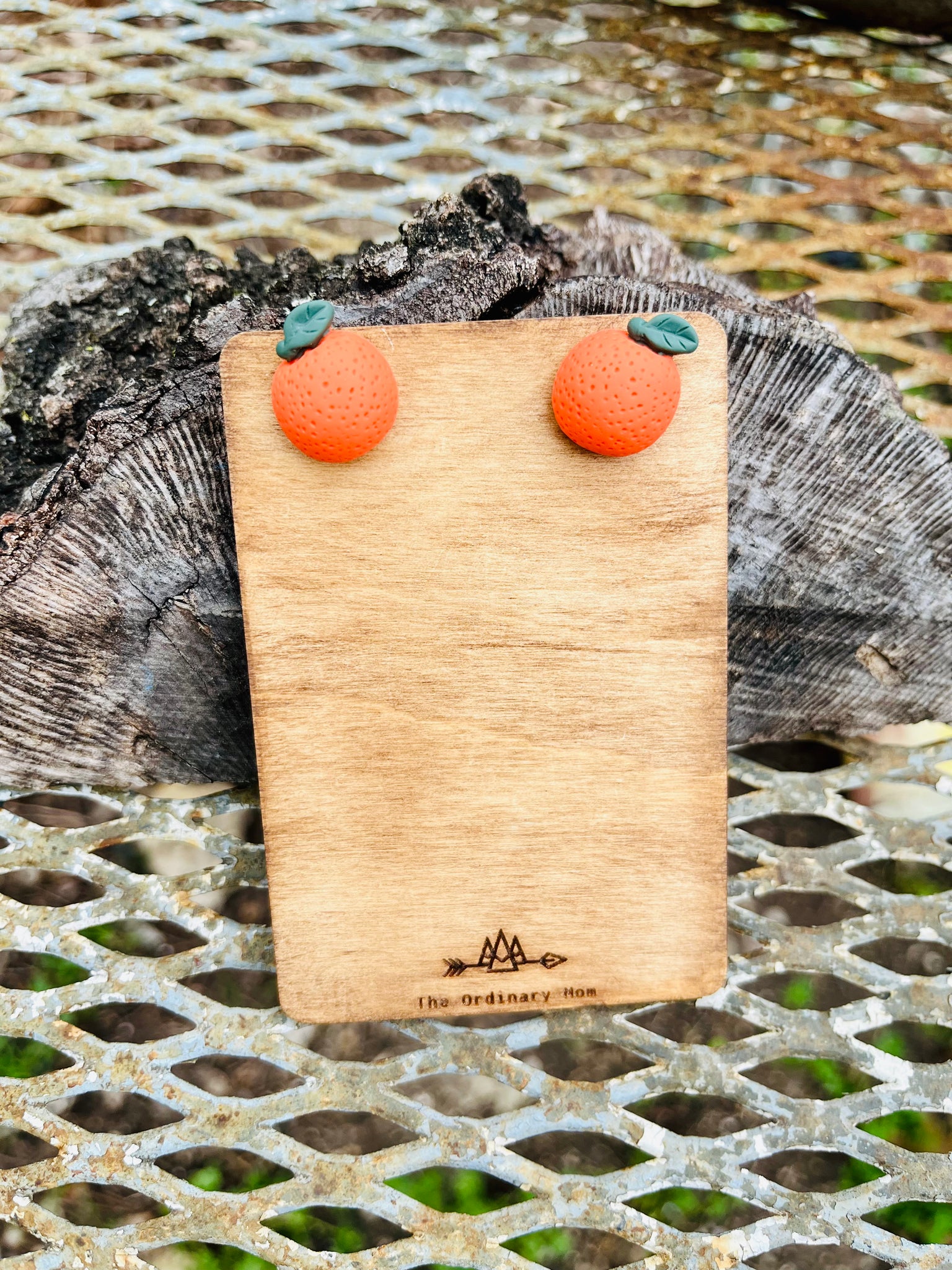 Each orange measures a little over one half inch, so a little bit of an oversized stud. Nickel and lead free hardware. Each earring comes with a rubber safety back for comfy all day wear.