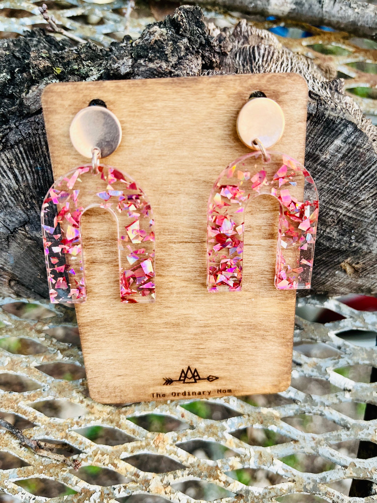 These laser cut acrylic earrings are mesmerizing! The rose gold flakes sparkle in the sun and are just gorgeous!