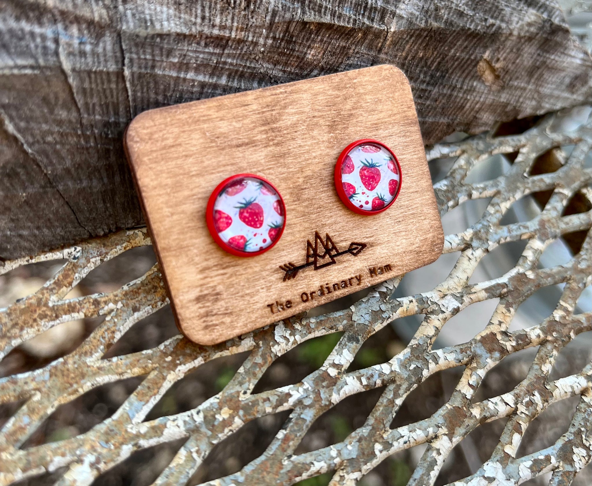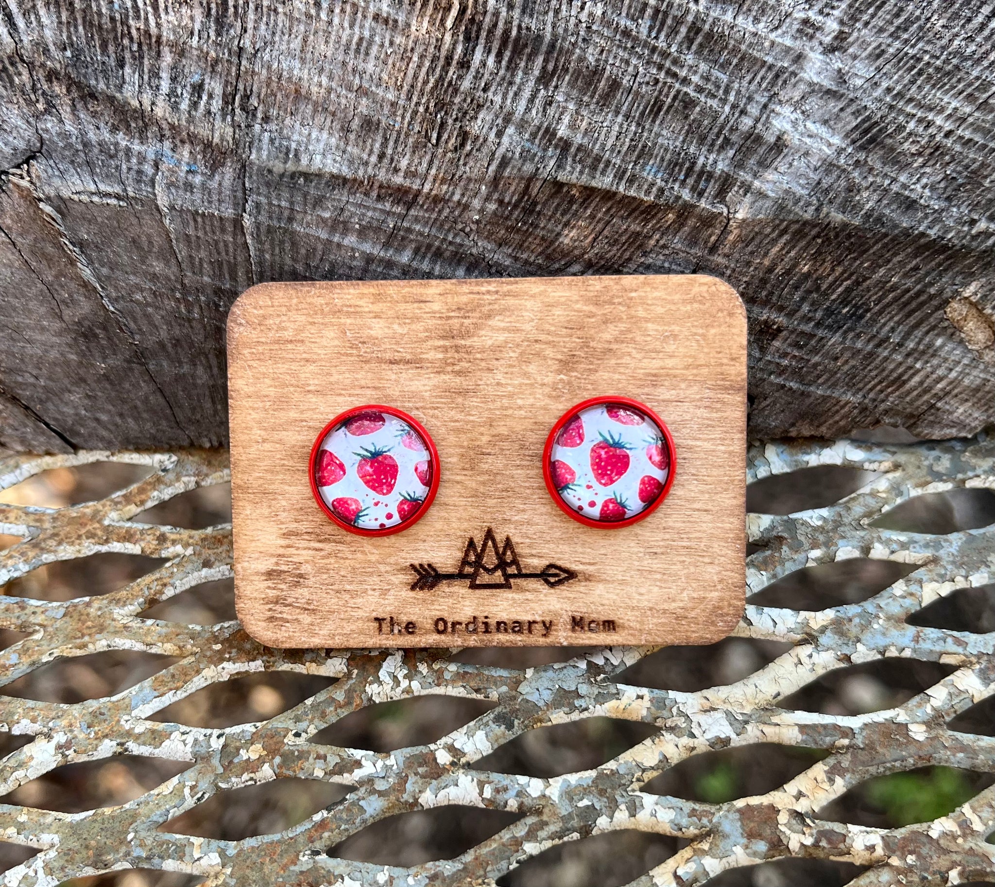 These glass dome studs feature a lovely strawberry print nestled in a nickel and lead free bezel. Earrings include a set of clear rubber safety backs for comfy all day wear.